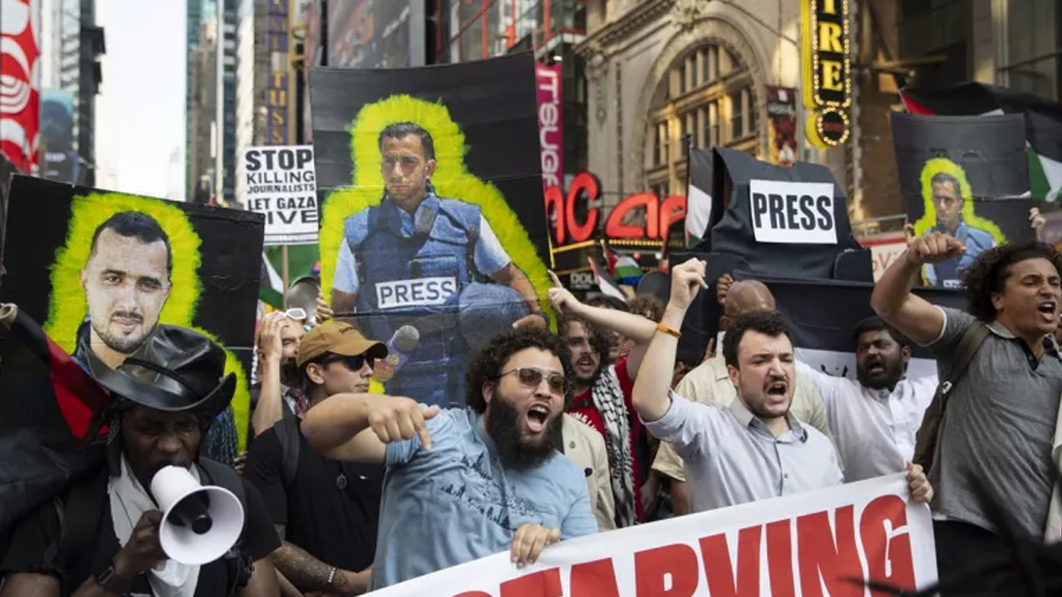 পিপলস ডিসপ্যাচের সাংবাদিক ও সম্পাদক জোই আলেকজান্দ্রা বলেন, তিনি গাজায় সহকর্মীদের প্রতি সংহতি জানিয়ে এই বিক্ষোভে অংশ নিয়েছেন।