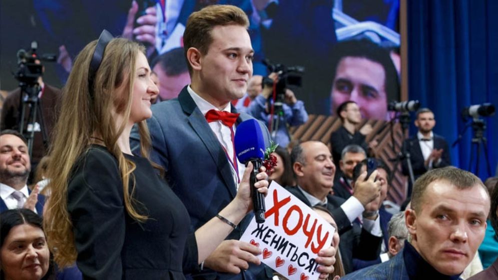 রুশ প্রেসিডেন্ট ভ্লাদিমির পুতিনের বার্ষিক লাইভ টেলিভিশন ভাষণ চলাকালে ঘটে গেল এক অভাবনীয় ও রোমান্টিক ঘটনা। ইউক্রেন যুদ্ধ আর বিশ্ব রাজনীতি নিয়ে উত্তপ্ত আলোচনার মাঝেই সরাসরি সম্প্রচারে নিজের প্রেমিকাকে বিয়ের প্রস্তাব দিয়ে বসেন এক রুশ সাংবাদিক।