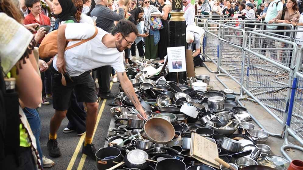 এবার সেই দৃশ্যের প্রতীকী অবতারণা ঘটানো হলো লন্ডনের ডাউনিং স্ট্রিটে যুক্তরাজ্যের প্রধানমন্ত্রী কিয়ার স্টারমারের কার্যালয়ের সামনে। শুক্রবার সেখানে হাজারো মানুষ বিক্ষোভ করেছেন। তারা সেখানে ১০০০ হাঁড়ি-পাতিল রেখে গাজায় ইসরাইলের ‘ইচ্ছাকৃত দুর্ভিক্ষ নীতির’ বিরুদ্ধে প্রতীকী প্রতিবাদ জানিয়েছেন।