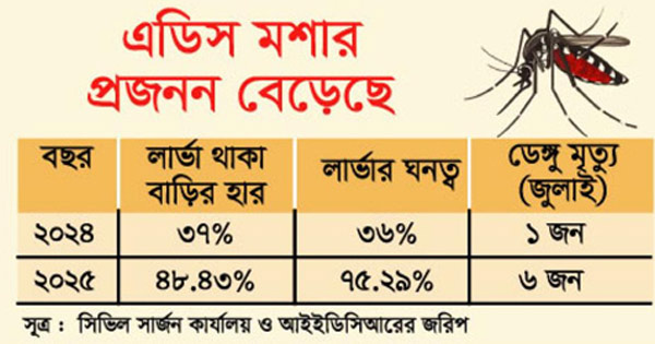 মাত্র এক বছরের ব্যবধানে চট্টগ্রামে এডিস মশার প্রজনন ও এডিস বাহিত রোগের বিস্তার মারাত্মকভাবে বেড়ে গেছে। সরকারের দুই প্রতিষ্ঠানের পরিচালিত জরিপে উঠে এসেছে ভয়াবহ চিত্র। ২০২৪ সালের তুলনায় ২০২৫ সালে বাসা-বাড়িতে এডিস মশার লার্ভার উপস্থিতি বেড়েছে ১১ দশমিক ৪৩ শতাংশ। একই অবস্থা এডিস মশার লার্ভার ঘনত্বের চিত্রেও। যেখানে ২০২৪ সালে এ হার ছিল মাত্র ৩৬ শতাংশ, সেটি ২০২৫ সালে পাওয়া গেছে ৭৫ শতাংশের বেশি। যা তুলনা করলে এডিস মশার ঘনত্ব দ্বিগুণের বেশি বেড়েছে।