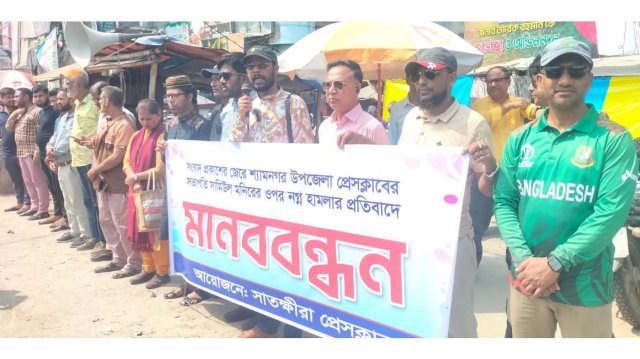 সংবাদ প্রকাশের জের ধরে সাতক্ষীরার শ্যামনগর প্রেসক্লাবের সভাপতি সামিউল মনিরের ওপর হামলার প্রতিবাদ এবং হামলাকারীদের গ্রেফতাদের দাবিতে মানববন্ধন অনুষ্ঠিত হয়েছে।
