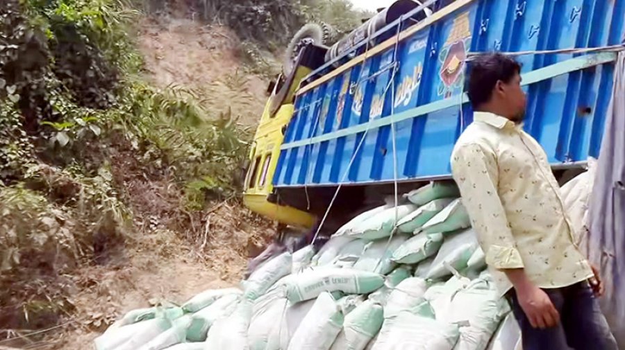 সিমেন্টবোঝাই ট্রাক উল্টে সড়কে ৪ ঘণ্টা যান চলাচল বন্ধ